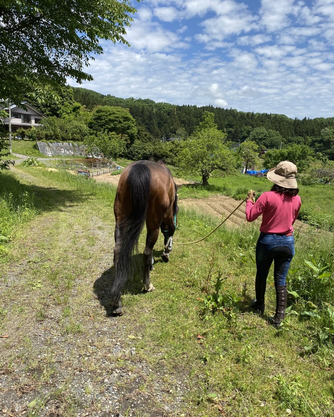 乗馬クラブで丹田乗馬の基礎レッスンの後、田んぼのあぜ道を馬に乗りながらお散歩